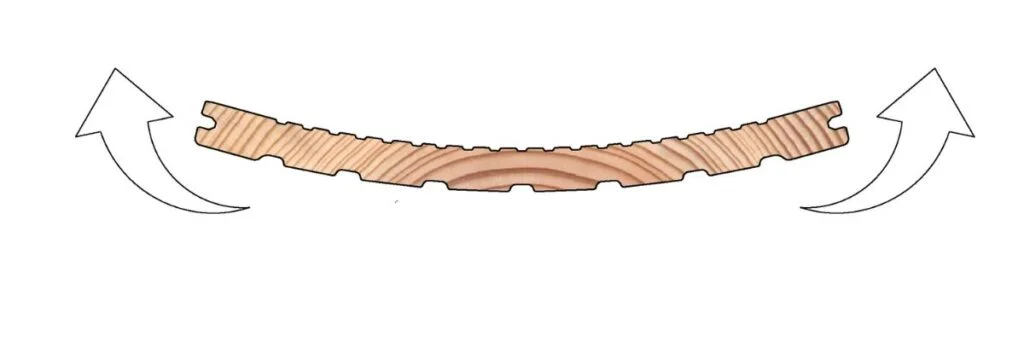 Όπως φαίνεται στη φωτογραφία της διατομής ενός προφίλ decking από σιβηρικό λάριξ, οι ετήσιοι δακτύλιοι είναι οριζόντια τοποθετημένοι σε σχέση με την πρόσοψη ή την πίσω όψη και παρουσιάζουν καμπυλότητα, η οποία τείνει να ισιώσει προς την αντίθετη κατεύθυνση (σύμφωνα με τα βέλη). Αυτό έχει ως αποτέλεσμα το προφίλ να στρέφεται ή να παραμορφώνεται, ή όπως θα έλεγαν οι ξυλουργοί με τον επαγγελματικό τους όρο για τέτοιες σανίδες, ότι θα “καμπυλώσει”, και αυτό φαίνεται ως εξής: